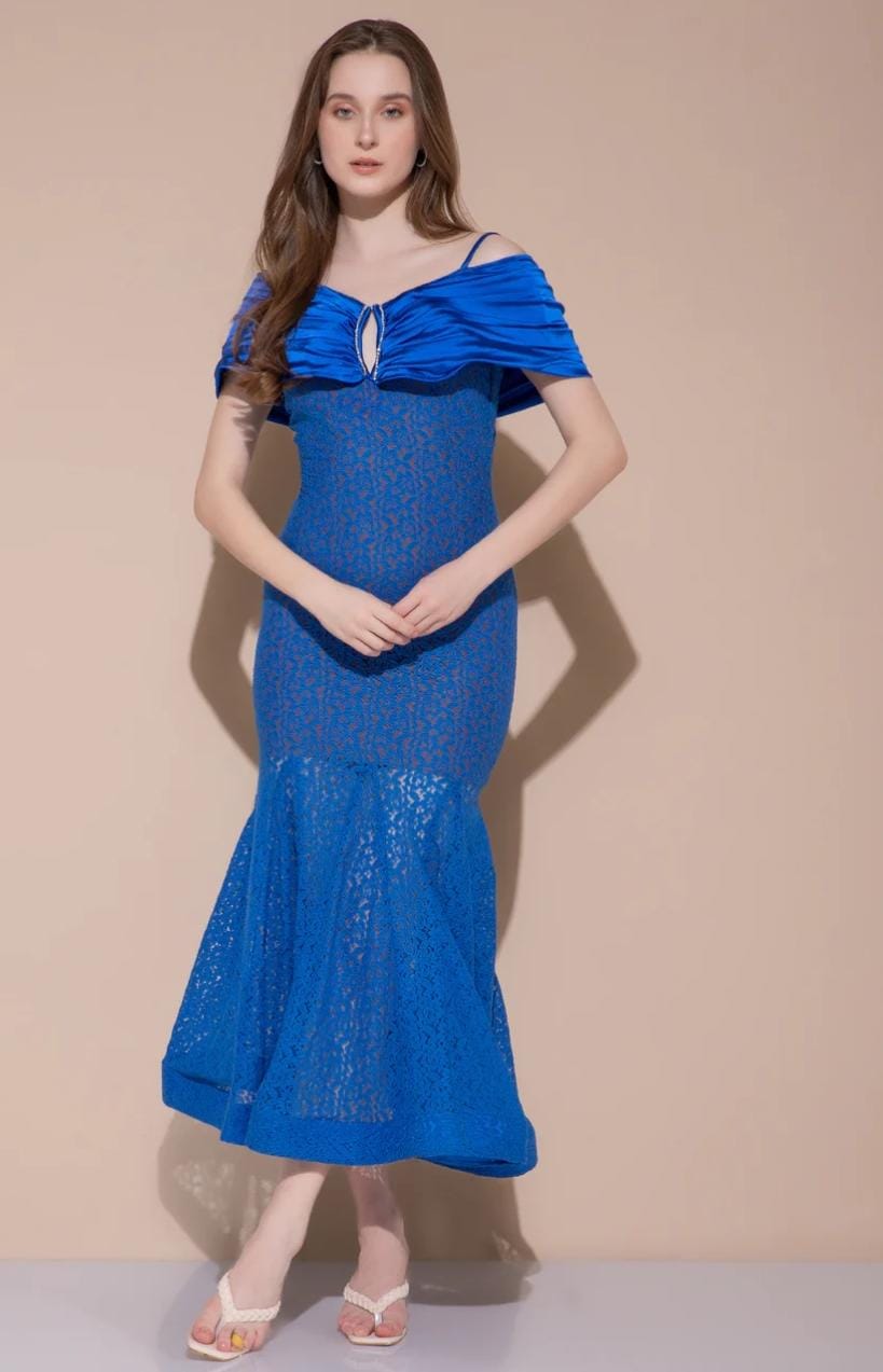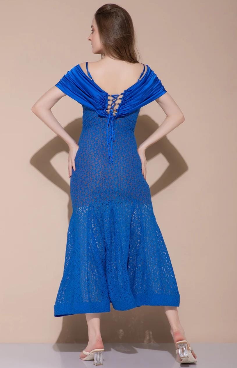 Dive into high-fashion allure with The Azure Mermaid. This vibrant cobalt blue maxi dress features a beautiful, form-fitting silhouette with a mermaid flare at the hem, made from an elegant open-knit lace over a solid-colored lining. The dress is designed with a dramatic and adjustable corset-style lace-up back, adding a sensual, custom fit. The neckline is complemented by an attached or matching draped off-the-shoulder cowl detail for a touch of romantic elegance. This show-stopping number is ideal for summer formal events and destination weddings