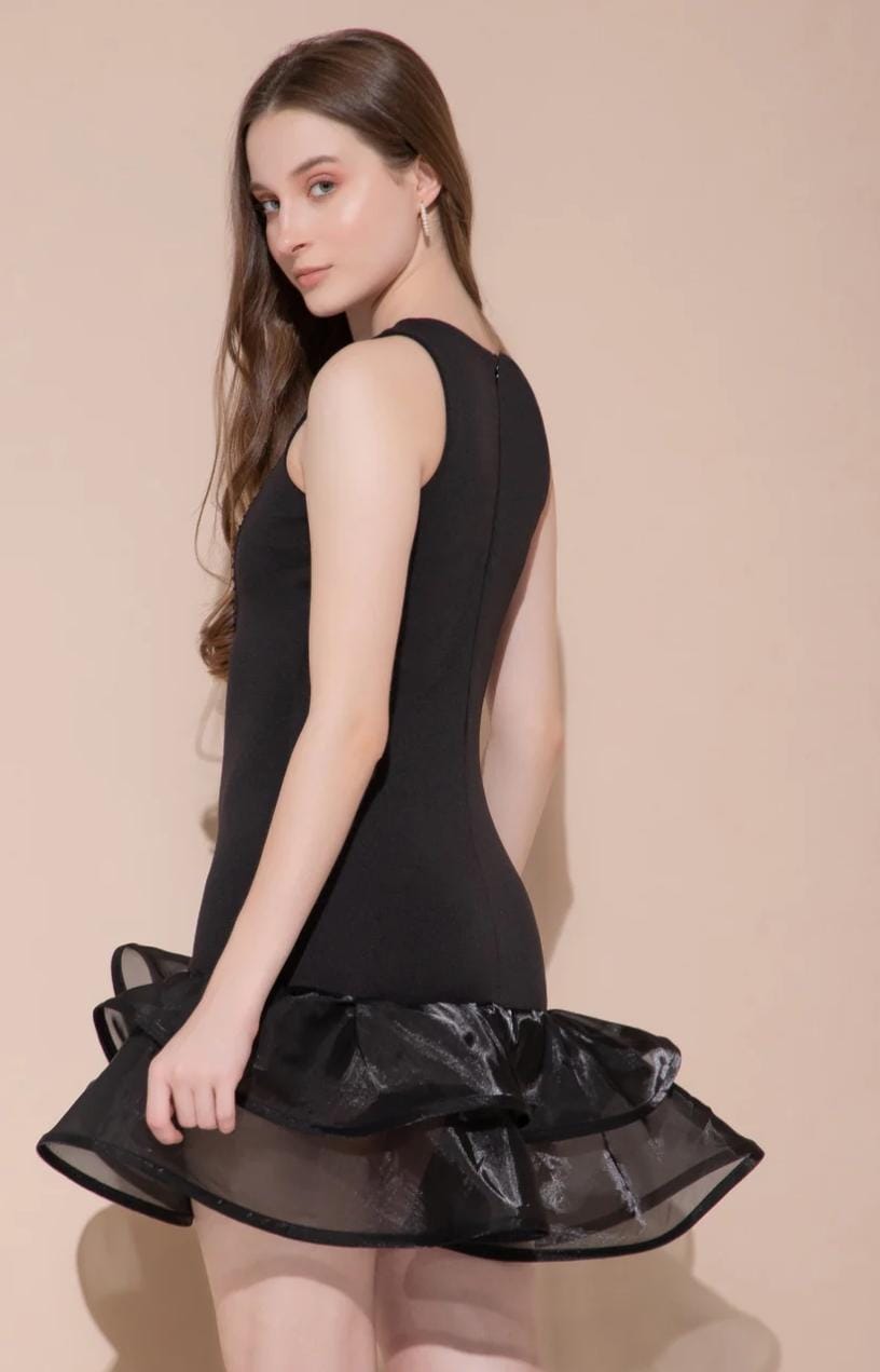 Elevate your ensemble with The Onyx Embellish. This sophisticated black sleeveless top features a high, round neckline that beautifully frames the face. The yoke is intricately detailed with a rich, textural design of black beadwork and embroidery, adding a layer of depth and glamour. The body is made from a form-fitting, comfortable stretch fabric, while the hemline bursts into a flirty, voluminous layered organza ruffle. While this image focuses on the top, the complete garment is an ideal choice for dance events or a dramatically chic night-out look.